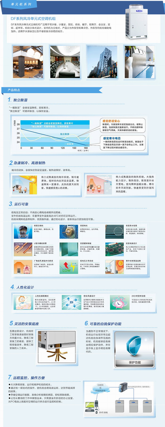DF系列風(fēng)冷單元式空調(diào)機(jī)可廣泛用于寫字樓、計(jì)量室、醫(yī)院、商場、餐廳、歌舞廳、會(huì)議室、賓館、超市等。不需要連接冷卻塔及水處理設(shè)備,適用于水源缺乏以及不便安裝冷卻塔的地方。