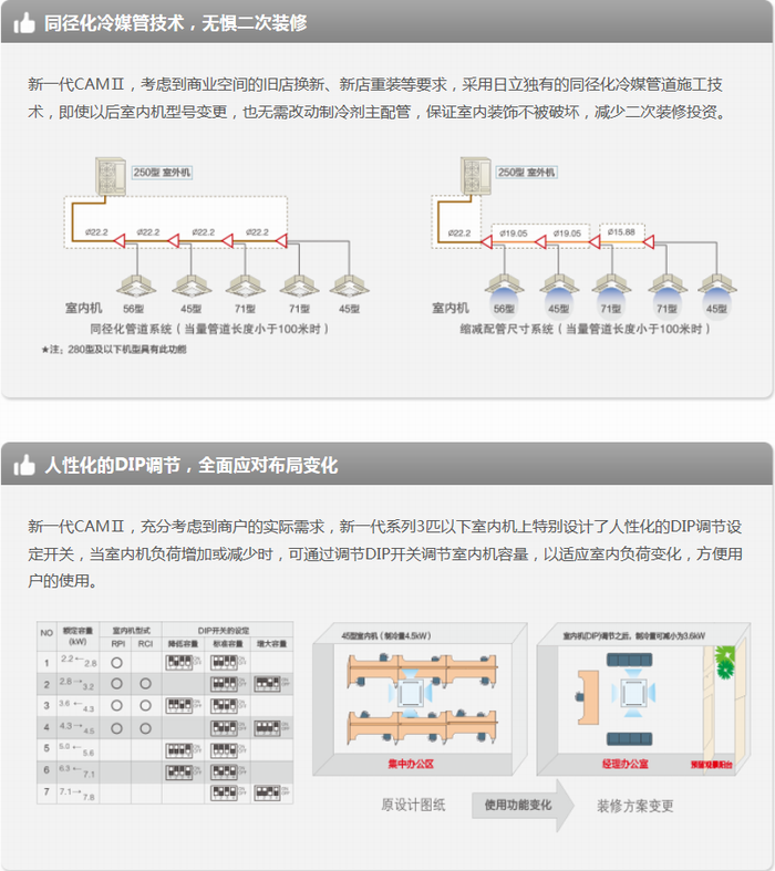 時代新生,為夢想而來。日立懂得高端商業空間的高品質、高舒適度的新生要求,專為中小型商鋪開發新一代CAMⅡ商用中央空調(Commercial Advanced Multi Air-condition)。通過日立優越的多聯機先進技術,以豐富多彩的室內機產品形式、多種人性智能化設計、多項領先的節能技術以及智能強大的控制系統,全方位實現中小型商用空間對環境時尚舒適、高效節能等高品質夢想。CAMⅡ 變頻多聯機系列產品特點: