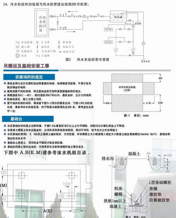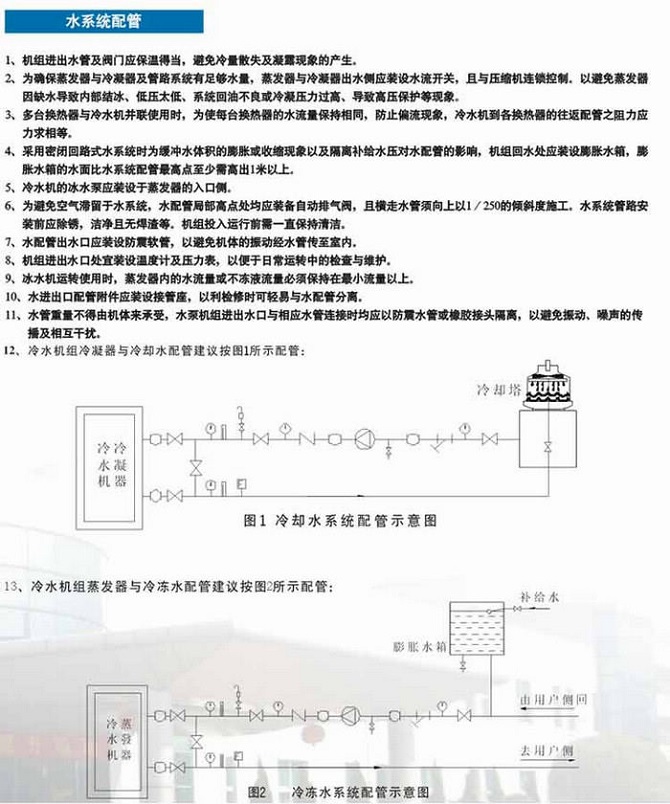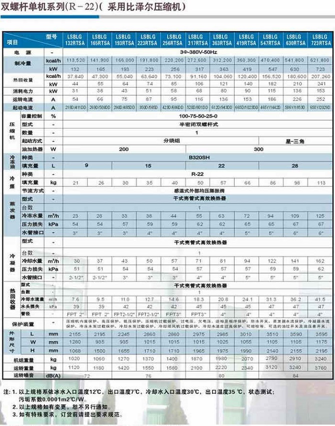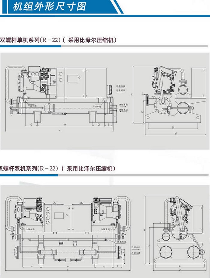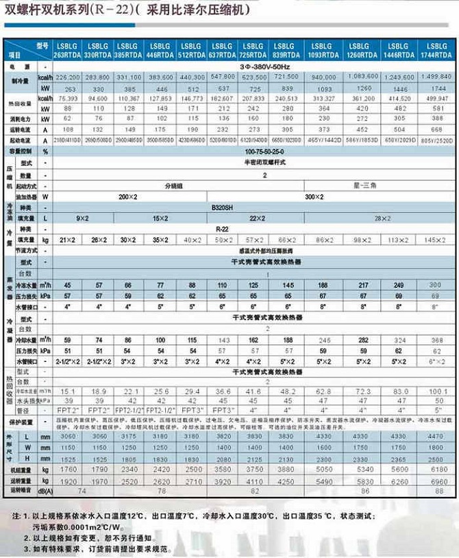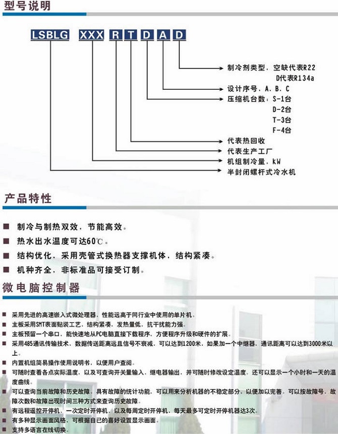 (1)機組壓縮機選用名牌半封閉螺桿式壓縮機及電控元件,配備換熱高效優質銅管制作的冷凝器及蒸發器;